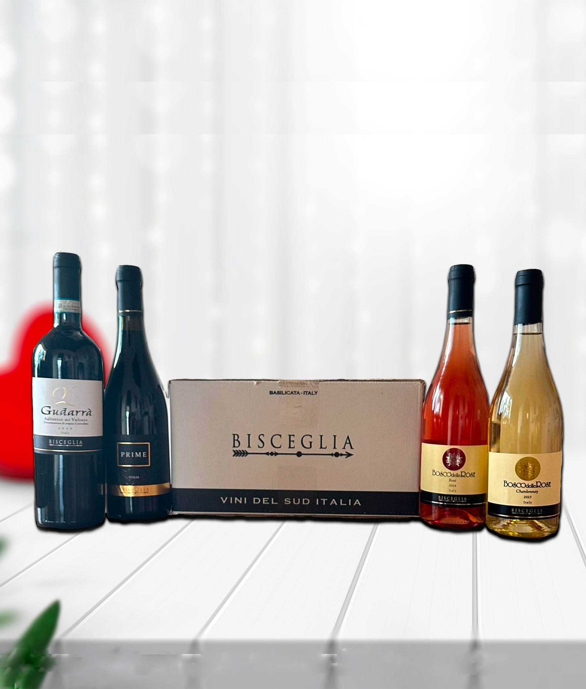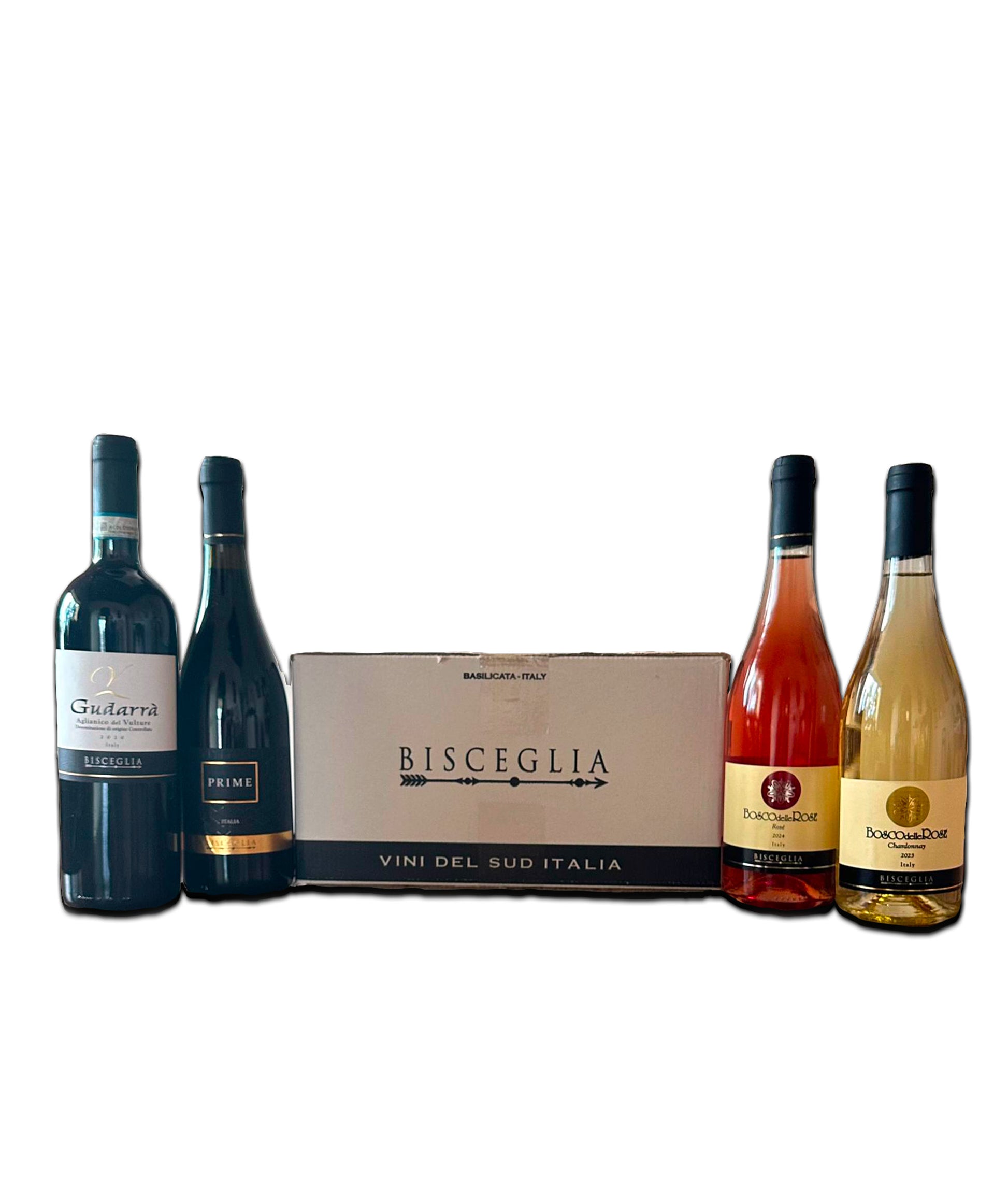 Questa confezione nasce per raccontare le diverse espressioni della cantina Bisceglia, mettendo insieme vini con caratteri distinti ma perfettamente complementari.